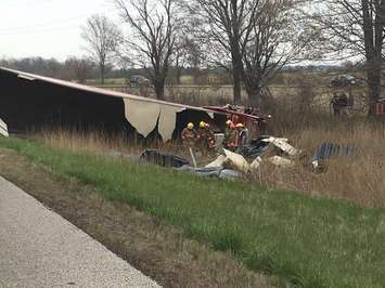 The Ontario Provincial Police say around 3pm on Saturday, a tractor trailer crossed through the centre median near Bloomfield Rd., travelled across the eastbound lanes, rolled over and came to rest in the south ditch of Hwy. 401. The tractor trailer was hauling rubber retread and the contents of the load spilled out into the ditch as it rolled over.