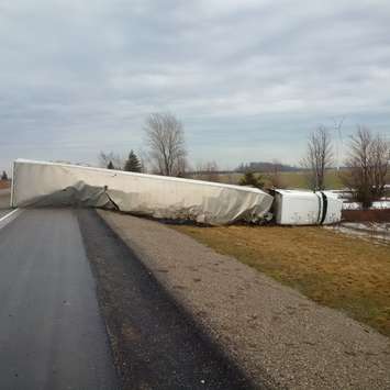 Chatham-Kent OPP say a tractor trailer travelling westbound on Hwy. 401 near Communication Rd. lost control, crossed through center median, and rolled onto its side around noon on Monday.