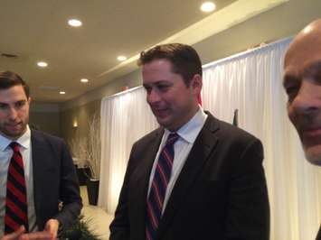 The opposition party leader spoke to a large crowd of about 150 at Smitty’s Restaurant on Thursday. He talked to the media about the North American Free Trade Agreement (NAFTA), marijuana, the Sombra Ferry and flooding but roasted Prime Minister Justin Trudeau several times during his 15-minute speech.
