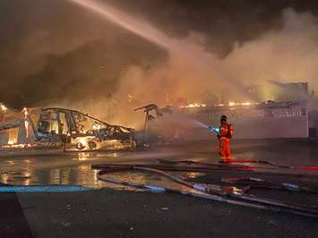 "Fire crews have a tanker shuttle in effect and secured the aerial unit to a hydrant with a number of Engines relaying water down Highbury Ave.," the London Fire Department said.