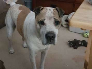 Huey is a Shar Pei/Bulldog mix, and has been missing since Friday, November 29. He was last seen near TSC in Listowel. Huey is white with a tan spot. He is wearing a black harness and possibly a blue leash.
