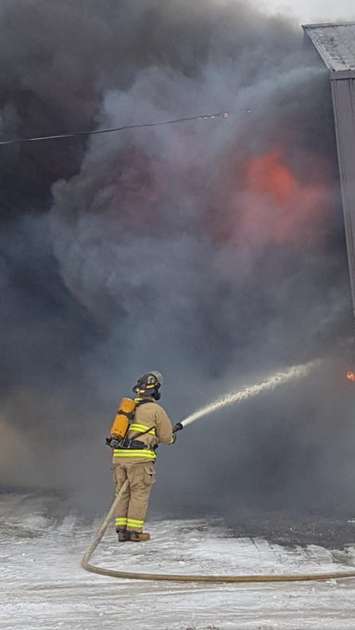 Perth East fire fighters battle a large structure fire south of Milverton. Photo courtesy of Perth East Fire Department.