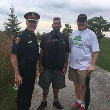 The snapshot was taken at a community walk last Sunday on the Ganatchio Trail in east Windsor, honouring an elderly woman who was attacked while on the trail. The picture features Mayor Drew Dilkens and Police Chief Al Frederick flanking James Godden, who has been identified as a member of the Soldiers of Odin. This group has been described as anti-immigrant and anti-Muslim.