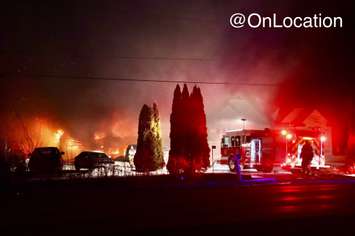Lakeshore Fire Stations 1 & 2 Crews are on scene of a fully involved barn fire in the 900 block of Talbot Rd. Ariel operations underway. Multiple units on scene. 2nd Alarm Assignment. O.P.P. on traffic. EMS on standby #Lakeshore pic.twitter.com/jl75yWF5pK