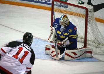 Sarnia Sting rookie Jordan Kyrou and Canada White were shut out 2-0 by Sweden at the RBC Centre.