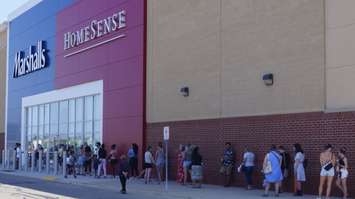 A line of shoppers outside the Marshalls-HomeSense in Sarnia on day one of Ontario’s three-phase reopening plan. 11 June 2021. (BlackburnNews.com photo by Colin Gowdy)
