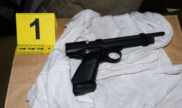 During a search of the residence, Sarnia police investigators located a .22 calibre pellet handgun concealed inside a piece of furniture.