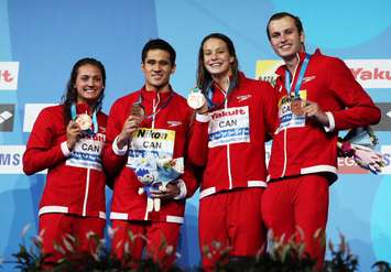 The mixed medley team of Penny Oleksiak, Richard Funk, Yuri Kisil, and Windsor's own Kylie Masse took the bronze medal in the 4X100 relay event Wednesday at the championships in Budapest, Hungary.