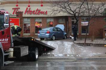 Officers recovered the stolen vehicle and arrested a 24-year-old suspect just after a car smashed into the side of a Tim Horton's at Park St. and Goyeau St. around 1:20pm.