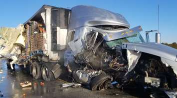 Ontario Provincial Police Constable Jim Root said the parked truck, equipped with an excavator, was parked around 8 a.m. on the south shoulder of County Road 18 near Graham Side Road, with part of the vehicle on the roadway itself. The second truck, loaded with produce, was travelling east on Road 18 when it hit the first truck and dislodged the excavator. Both tractor-trailers were heavily damaged but no one was hurt.