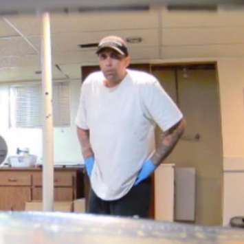 The suspect is described as a white male, approximately late 30s to early 40s, clean shaven, with an average build and tattoos on both forearms. At the time of the incident, he wore a black hat, white t-shirt, black pants and what appears to be blue latex gloves.