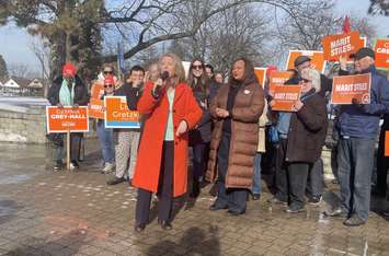 Marit Stiles held a small, but responsive rally Monday afternoon at Windsor's Lanspeary Park, accompanied by local NDP candidates Lisa Gretzky of Windsor West, Gemma Grey-Hall of Windsor-Tecumseh, and Rachael Mills of Essex.