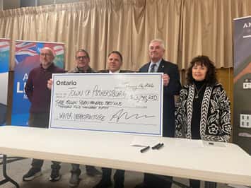 MPP Anthony Leardi presents a cheque to the Town of Amherstburg for a sanitary sewer project, January 16, 2026. (Photo by Maureen Revait)MPP Anthony Leardi presents a cheque to the Town of Amherstburg for a sanitary sewer project, January 16, 2026. (Photo by Maureen Revait)