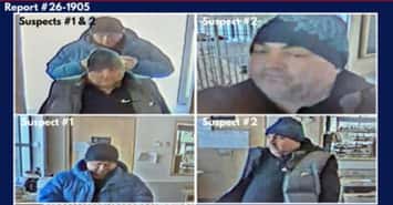 The first suspect is a white man, 5'8", large build, and clean shaven. He's between 45 and 55-years-old, and was wearing a black Nike hoodie, grey puffy vest, blue toque with wording on it, dark-coloured jeans or dress pants, and brown dress shoes.